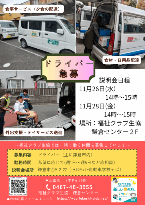 鎌倉 ドライバー募集説明会【2025年11/26、28】 業種 食事サービスW.Co 移動サービスW.Co 世話焼きW.Co 開催場所・開催日時 11/26(水)14:00~15:00 鎌倉センター2F 11/28(金)14:00~15:00 鎌倉センター2F アクセスMap この説明会に申し込む