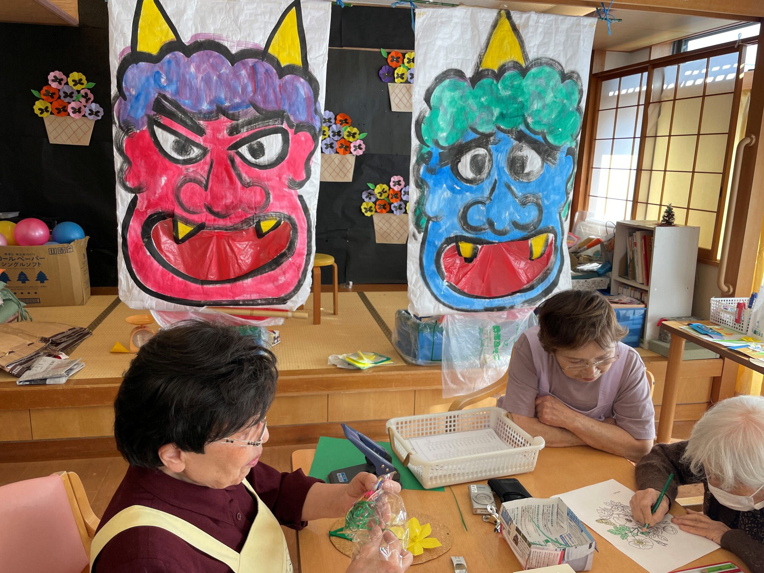 例えば和紙を染め自分のうちわを作ったり、トランプや百人一首のゲームも盛んで大いに盛り上がっています。又利用者が台本を書き皆で舞台装置を作って「Dayひよし小劇場」は毎年大好評。声を出し、笑い、頭を使い、体を動かすこと。「Dayひよし」が元気の源です、と家族からも喜ばれています。又こんな雰囲気を地域の方に見て頂きたいと見学会を開催しています。