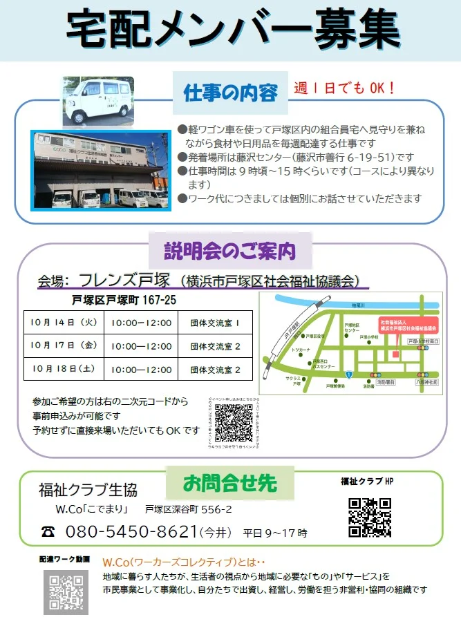 福祉クラブの食材を組合員宅までお届けするメンバーを募集しています。同じ曜日の決まった戸塚区内のコースです。自分の趣味や子育てとも両立できます。