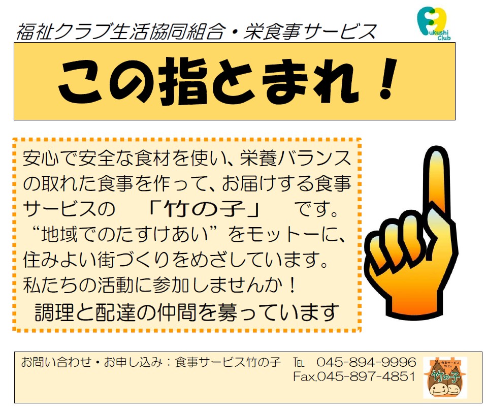 2008年8月より事業開始。栄区は横浜市でも高齢化率が高く孤立化が進む中、年老いても住み慣れた地域で可能な限り暮らし続けたいと多くの人は願っています。私たち食事サービス「竹の子」は『食べる事は、生命を維持していく上で重要な事』と、安心・安全な食材で「作る」、ご自宅まで「届ける」、安否を確認しながら「ケアする」を理念とし活動しています。